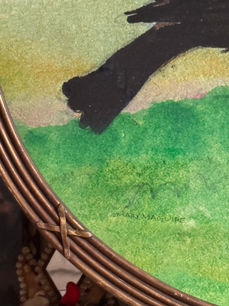 Framed giclée print with additional hand-coloring of a watercolor of a black bird by Mary Maguire.