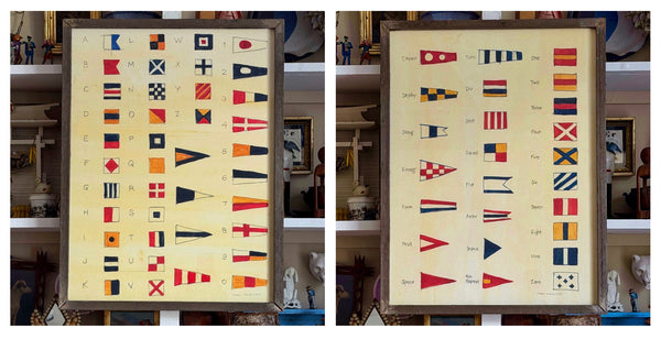 Framed giclée prints with additional hand-coloring of a watercolor pair of nautical flags by Mary Maguire.