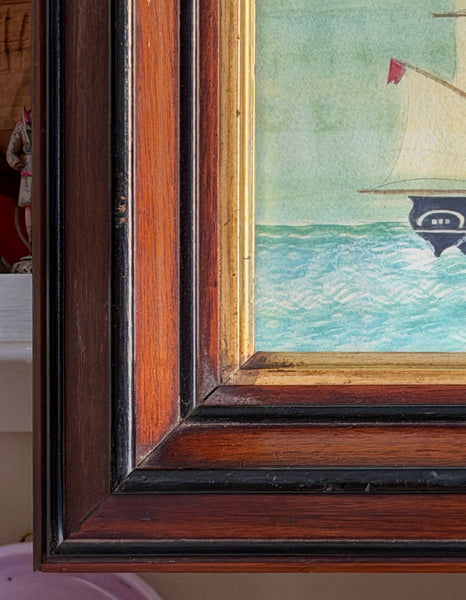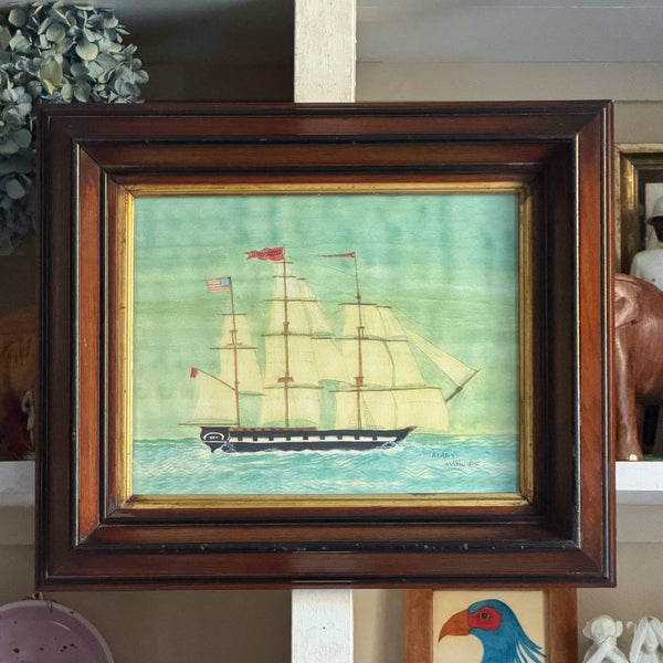 Framed giclée print with hand coloring of a watercolor of the 'Ship Brooklyn' by Mary Maguire.