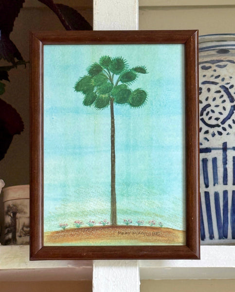 Framed miniature giclée print with additional hand-coloring of a watercolor of a palm tree by Mary Maguire.