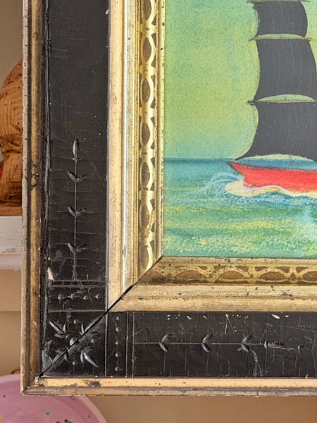 This ship is framed in a handsome antique ebonized Eastlake walnut frame with spoon-carved corner detailing and triple gold gilt liners measuring 13 x 15 inches.