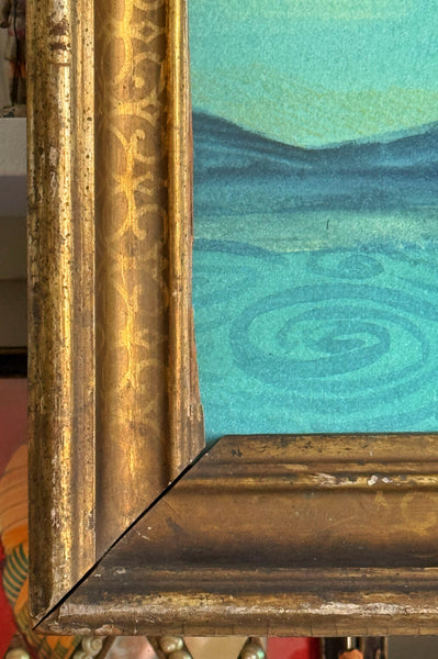 Framed behind glass in a beautiful antique distressed burnished gold gilt wood frame with a fabulous pattern measuring 25 3/4 x 33 3/4 inches.