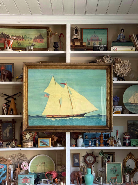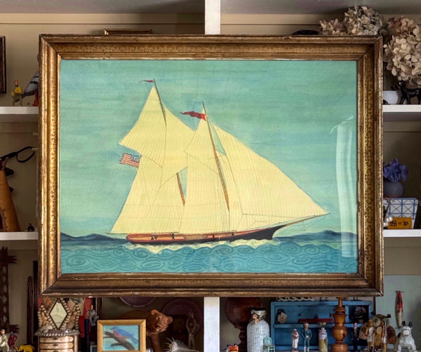 A framed large-scale giclée print with additional hand-coloring of a watercolor of a clipper ship by Mary Maguire.