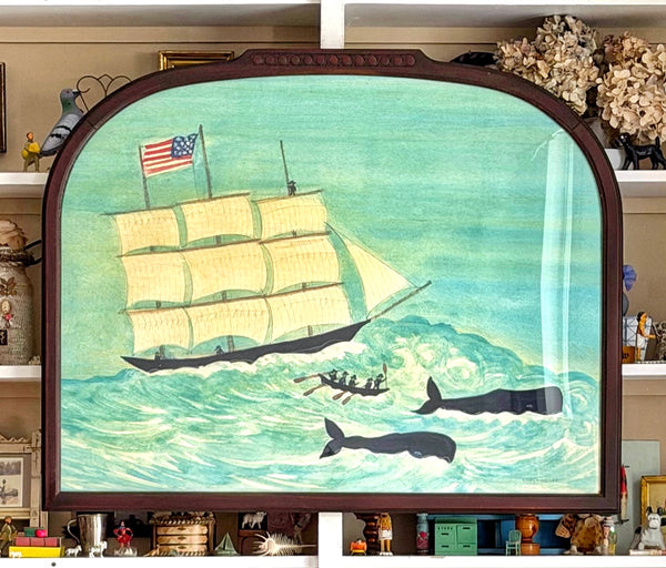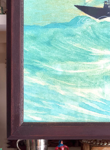 Framed large scale giclée print of a watercolor of a whaling scene with additional hand-coloring by Mary Maguire.