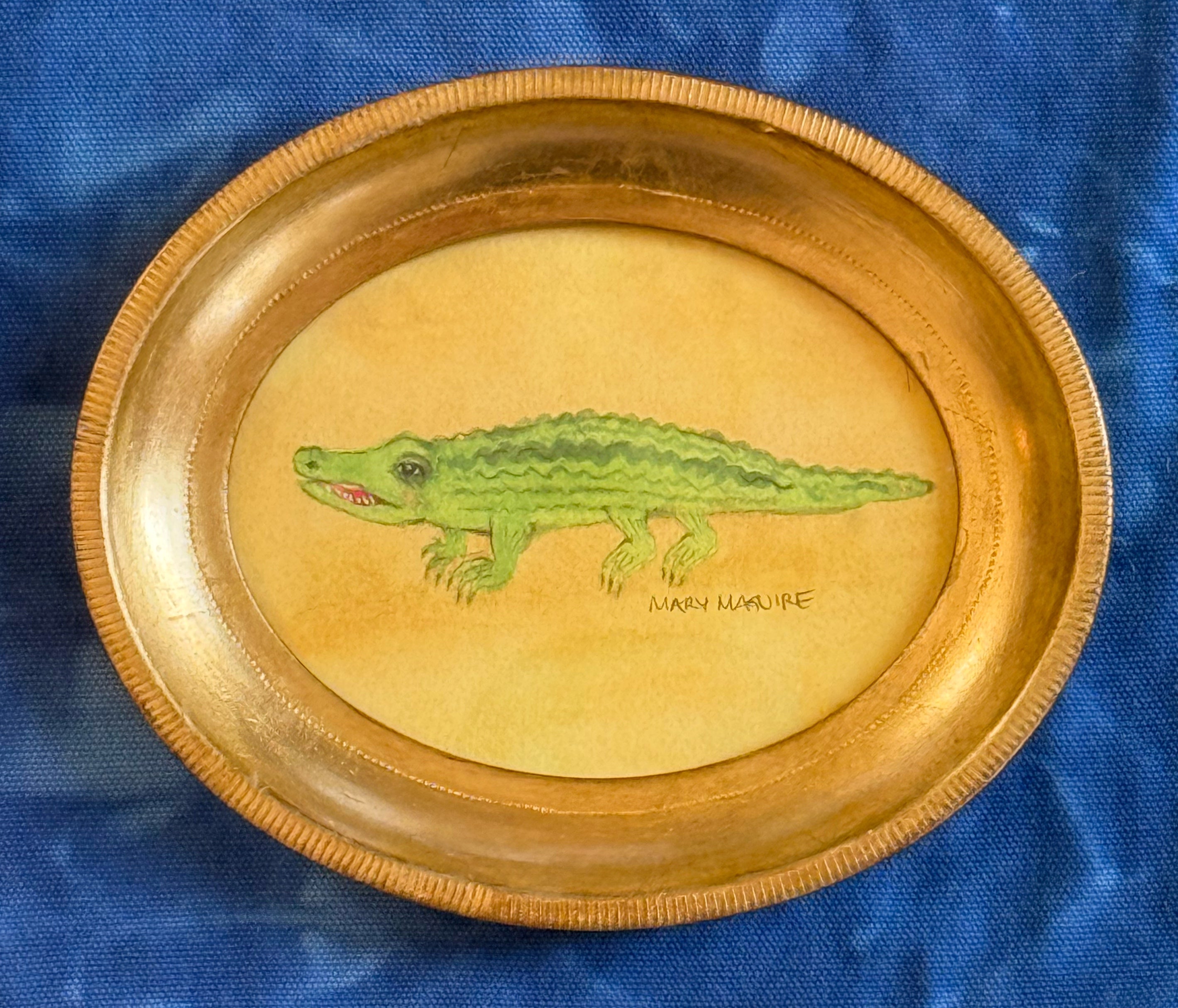 Framed miniature giclée print with hand coloring of a watercolor of an alligator by Mary Maguire.
