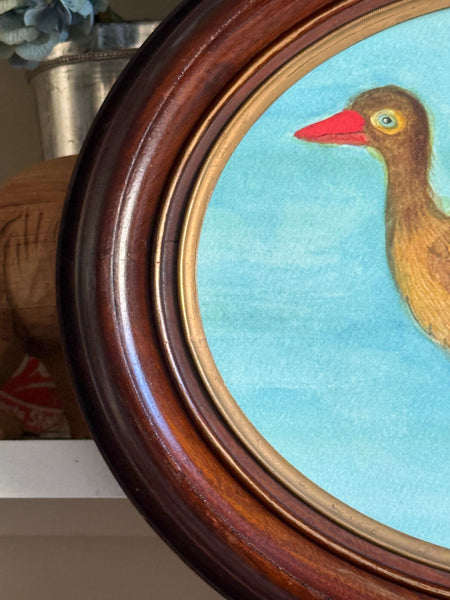 Framed behind glass in a deep dark-walnut antique oval frame measuring 10 3/4 x 13 inches.