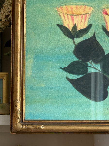Framed behind glass in a beautiful 1930's gold gilt wood frame with corner detailing measuring 17 3/4 x 22 inches.