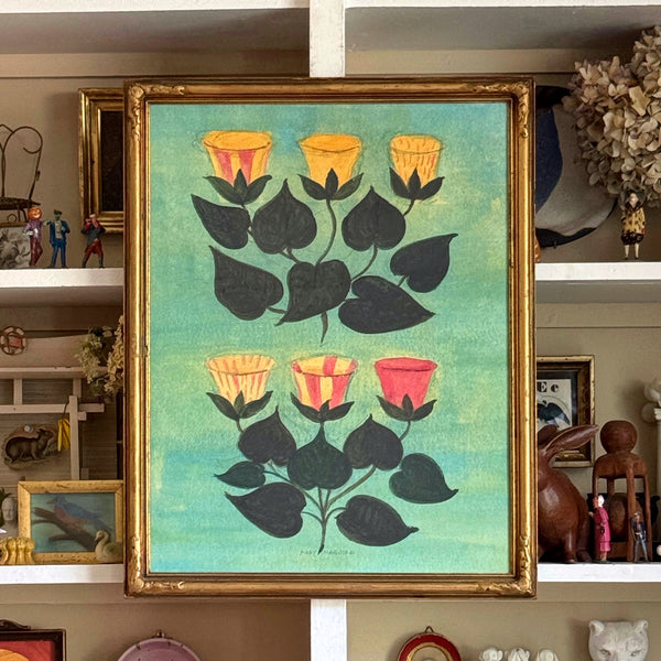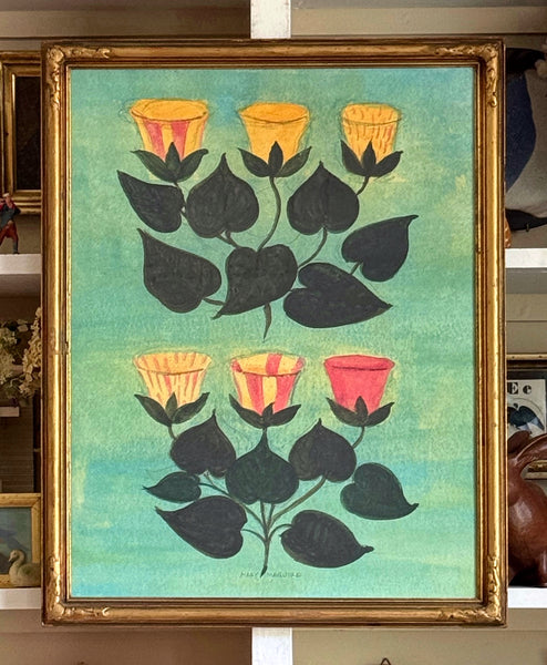 A framed giclée print with additional hand-coloring of a watercolor of bellflowers by Mary Maguire