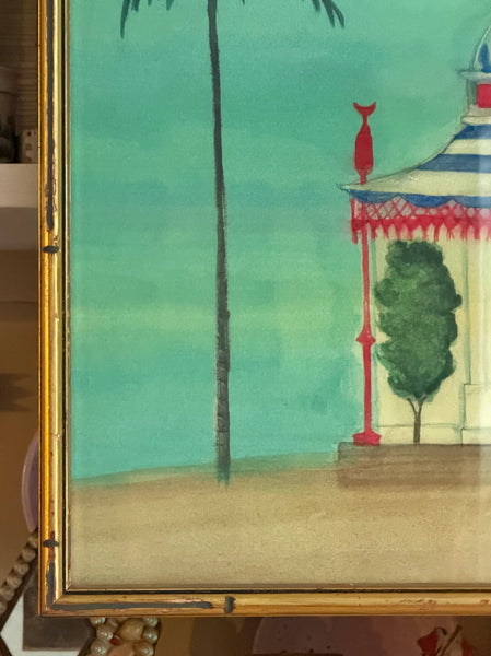 Framed giclée print with additional hand-coloring of a watercolor of a 'Garden Folly' by Mary Maguire.