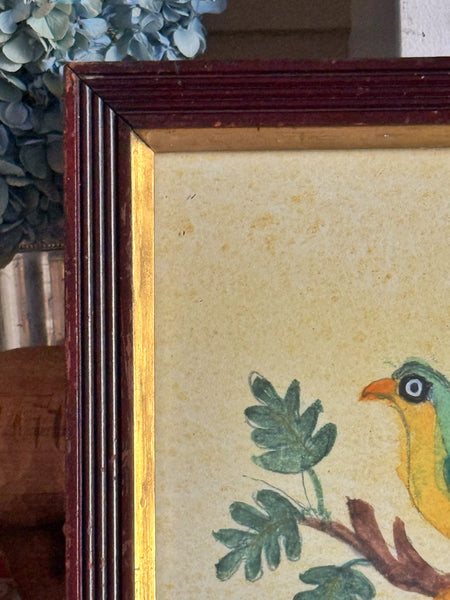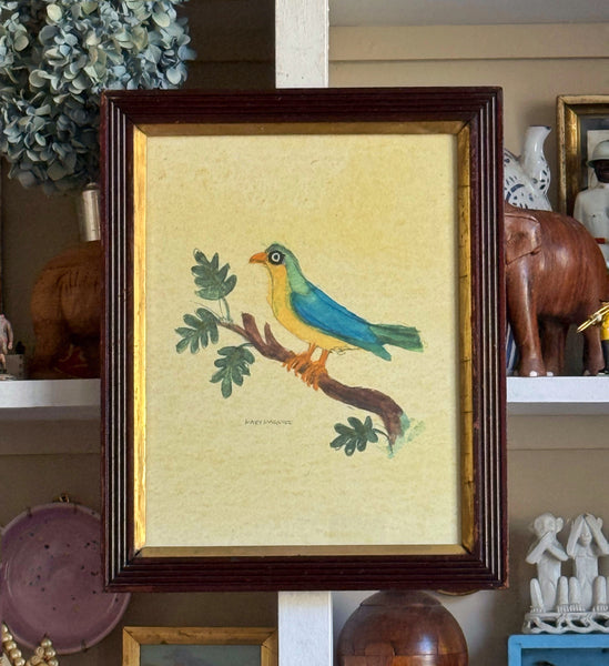 Framed giclée print of a watercolor of a bluebird on a branch with hand coloring by Mary Maguire.
