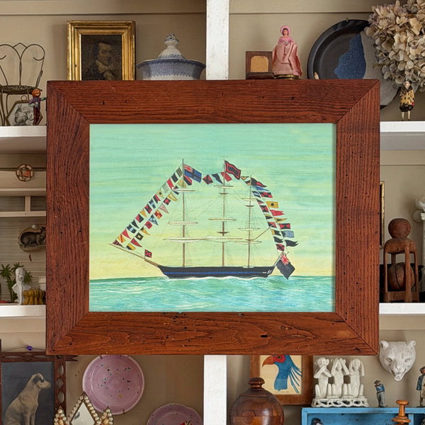 Framed larger-scale giclée print with hand coloring of a watercolor of a ship with 'All Flags Flying' by Mary Maguire.