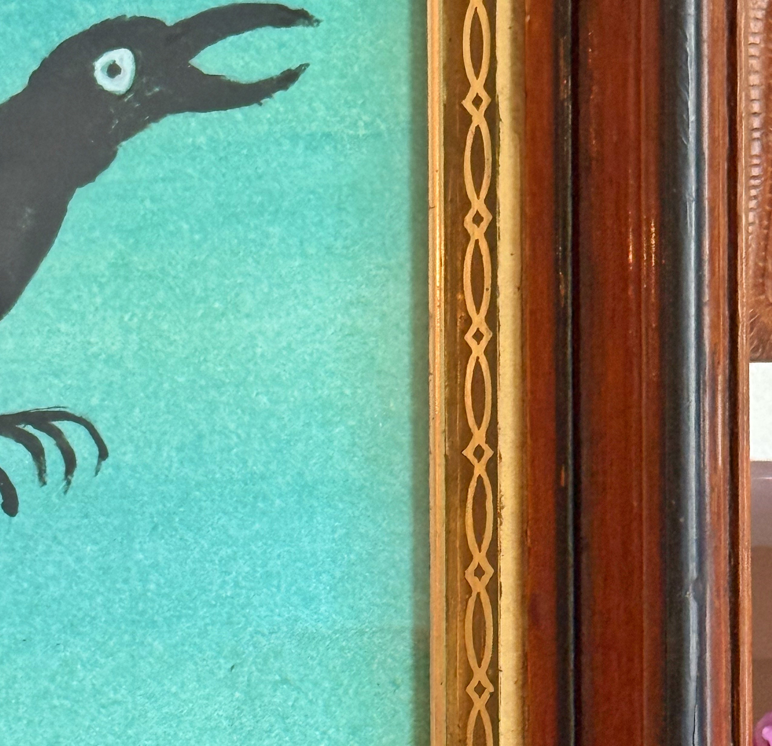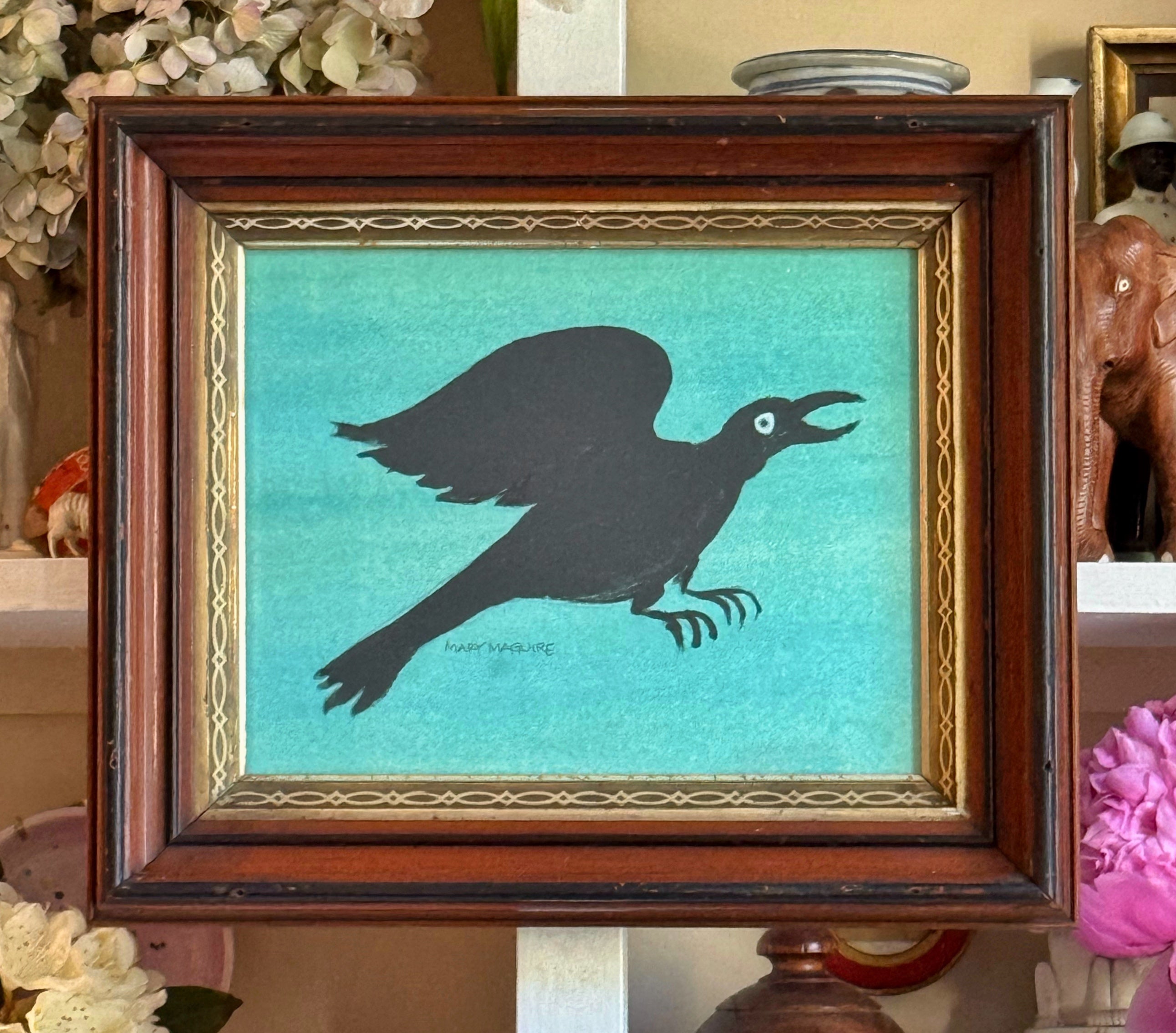 Framed giclée print with additional hand-coloring of a watercolor of a crow by Mary Maguire.