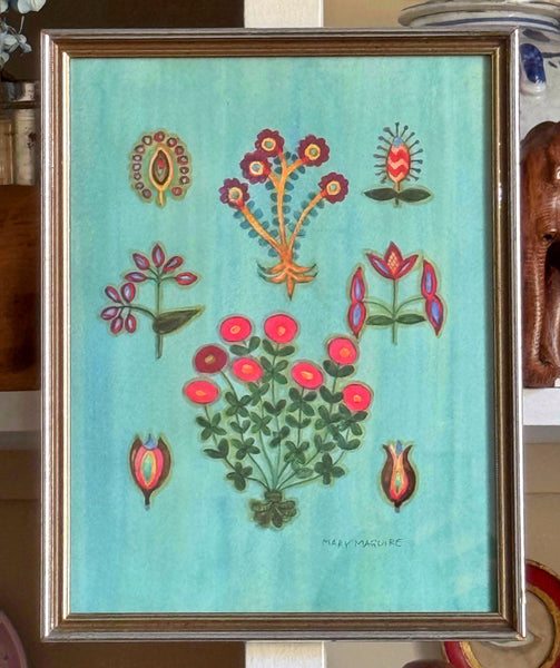 Framed giclée print with additional hand-coloring of a floral watercolor inspired by embroidery patterns Mary Maguire.