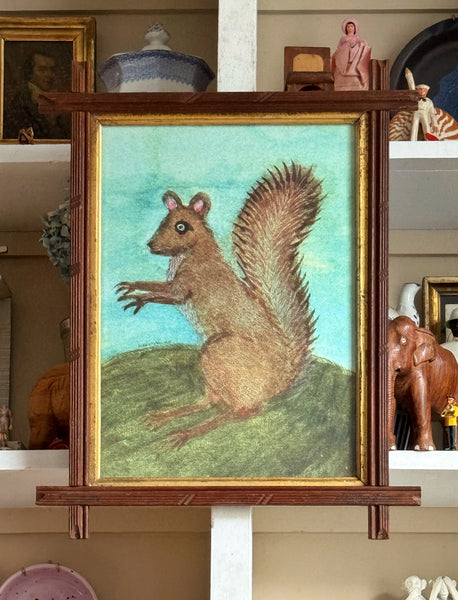 Framed giclée print with hand coloring of a watercolor of a grey squirrel by Mary Maguire.
