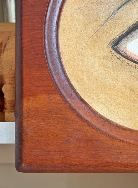 Framed behind glass in an antique darkwood frame with an oval inset sight measuring 9 1/2 x 11 1/2 inches.