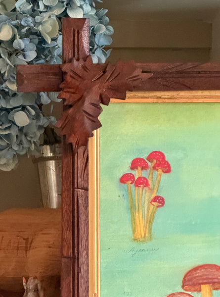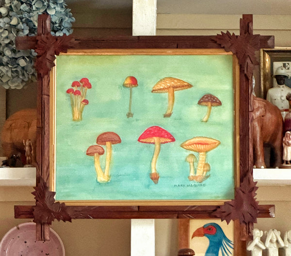 Framed giclée print with additional hand-coloring of a watercolor of meadow mushrooms by Mary Maguire.