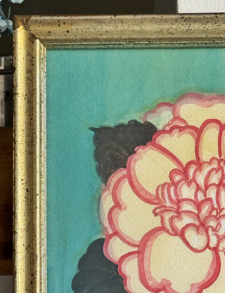A framed giclée print with additional hand coloring of a watercolor of a pink blooming rose by Mary Maguire.