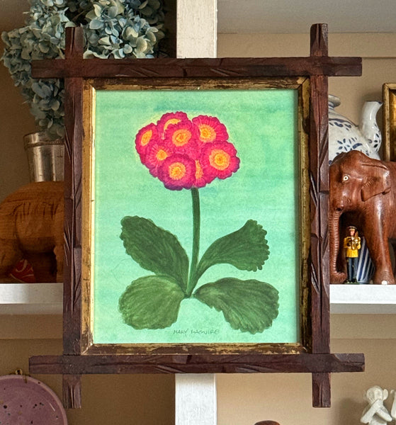 Framed giclée print of a watercolor with additional hand-coloring of a summer primrose by Mary Maguire.