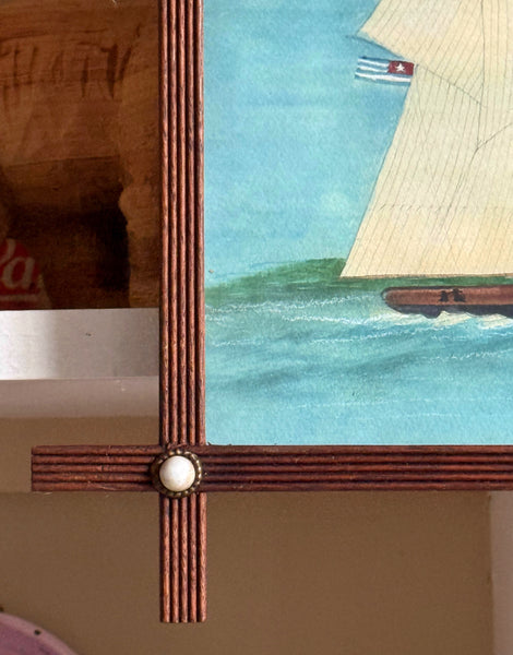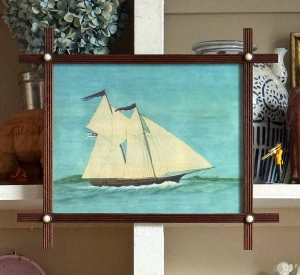 A framed giclée print with additional hand-coloring of a watercolor of a clipper ship by Mary Maguire.