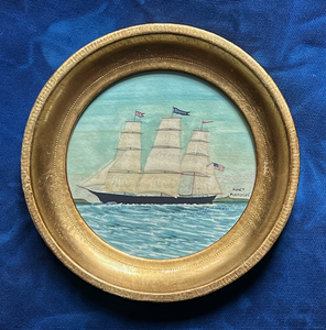 Framed giclée print with hand coloring of a watercolor of a ship at sea by Mary Maguire.