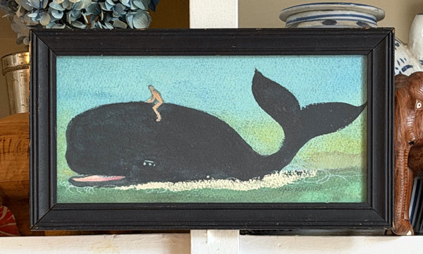 Framed giclée print with additional hand coloring of a watercolor of a whale rider by Mary Maguire.